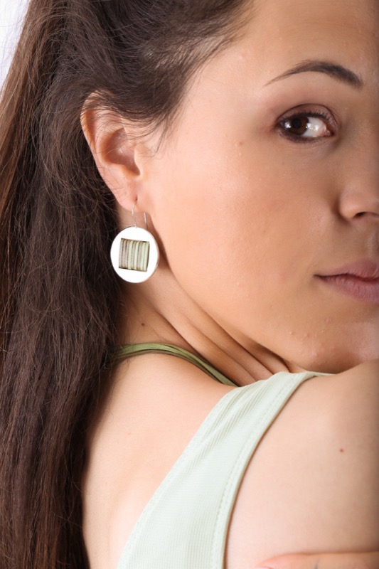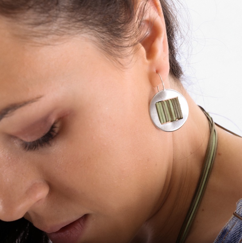 Arracades circulars amb disc de plata de llei i lato de tons verdosos. Tanca oberta.